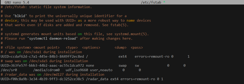 创建一个挂载点目录,并将 RAID 阵列挂载到该目录。这里是/radar_data