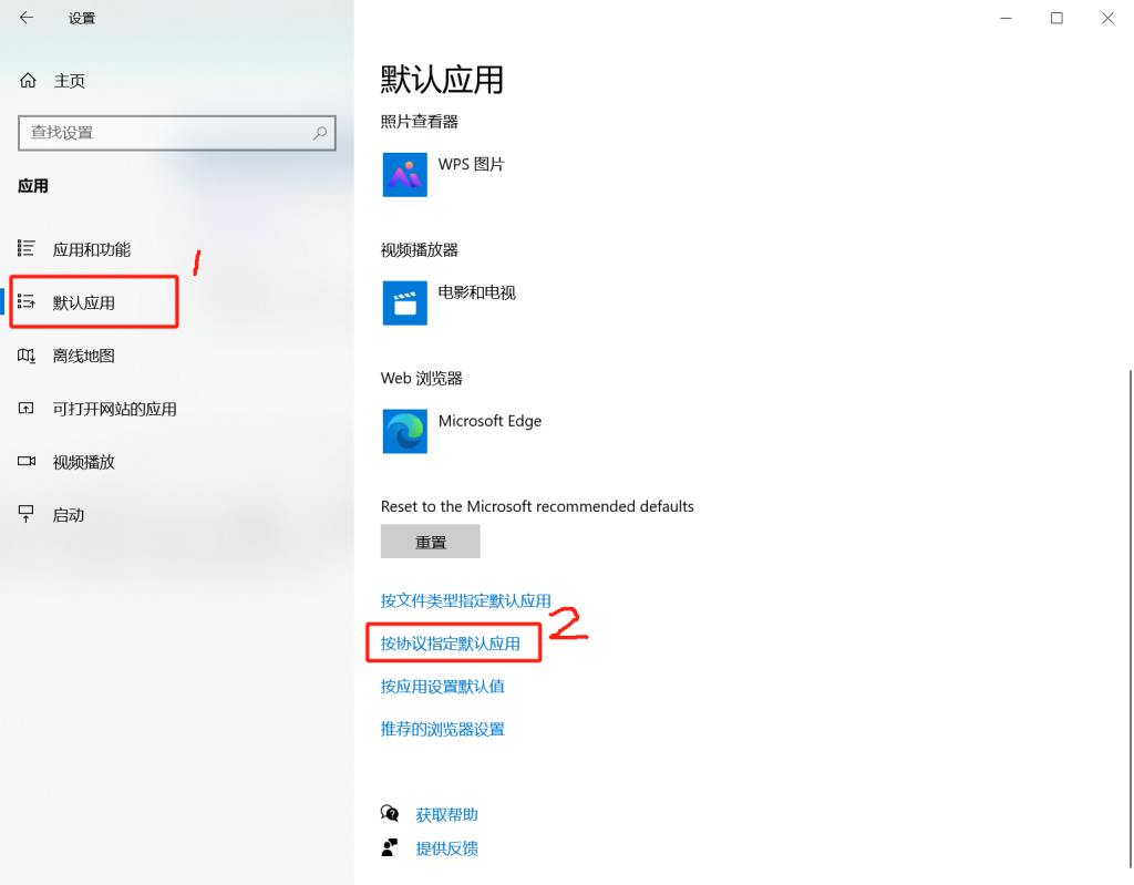 设置–应用–默认应用–按协议指定默认应用:
