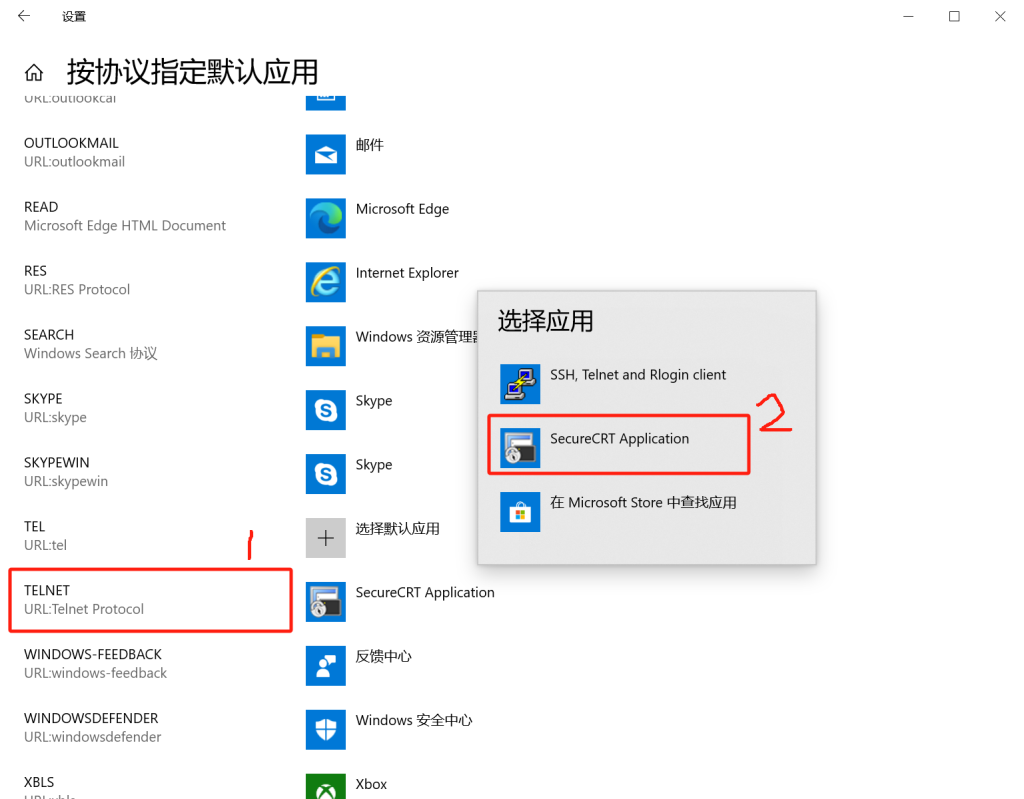 找到Telnet协议,选择默认应用为SecureCRT。