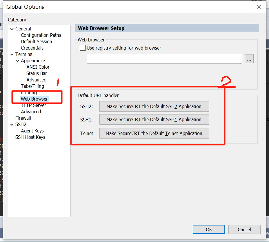 第二步:打开SecureCRT,在Options–Global Options–Web Browser中,将CRT设置为浏览器的默认应用。